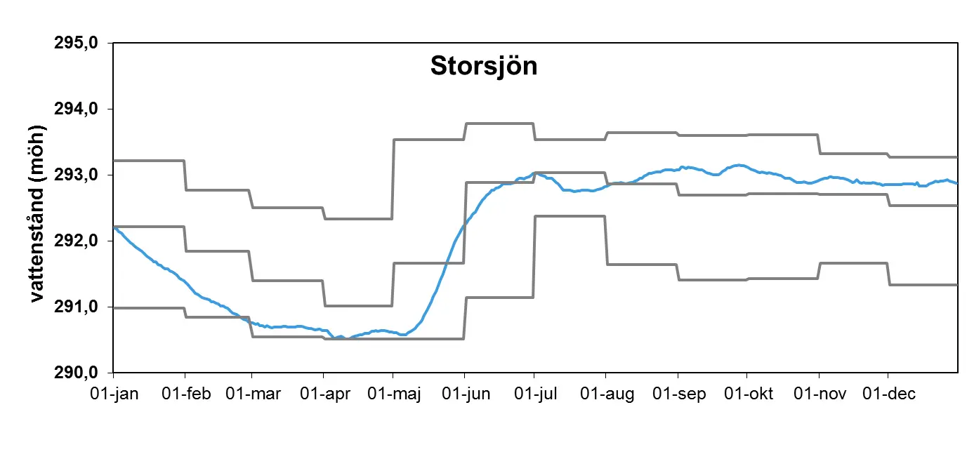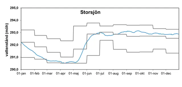 Förstora bildenDen blå linjen visar vattenståndet i Storsjön 2013. De grå linjerna representerar de högsta och lägsta uppmätta månadsvärdena samt månadsmedelvärde för perioden 1940-2010. Alla nivåer anges i meter över havet i höjdsystemet RH00. Data har samlats in av Vattenregleringsföretagen i Östersund.