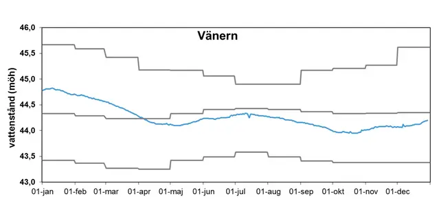 Förstora bildenDen blå linjen visar vattenståndet i Vänern 2013. De grå linjerna representerar de högsta och lägsta uppmätta månadsvärdena samt månadsmedelvärde för perioden 1939-2010. Alla nivåer anges i meter över havet i höjdsystemet RH00. Data har samlats in av Vattenfall.