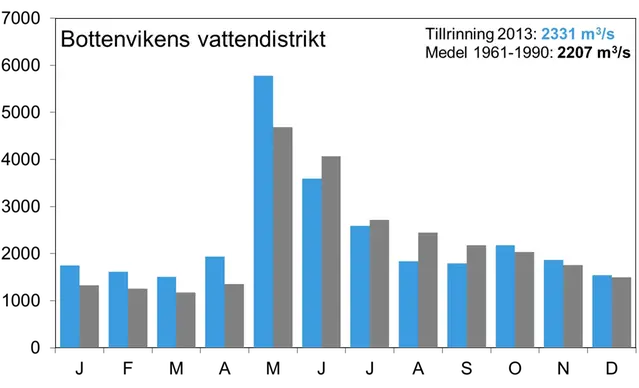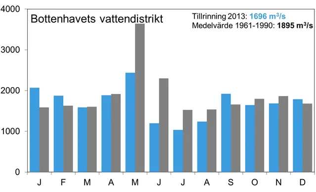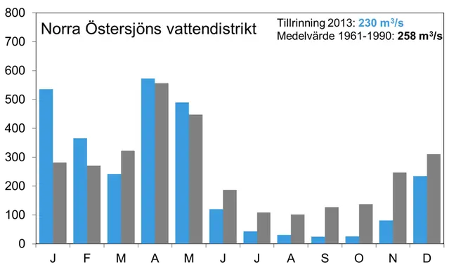 Den blå stapeln i graferna nedan visar tillrinningen 2013, den grå visar medelvärdet för normalperioden 1961-1990.