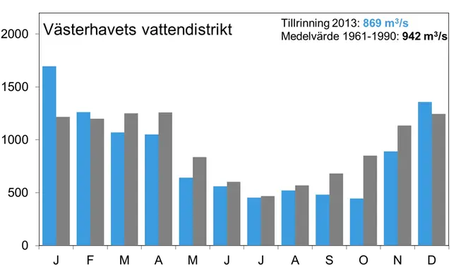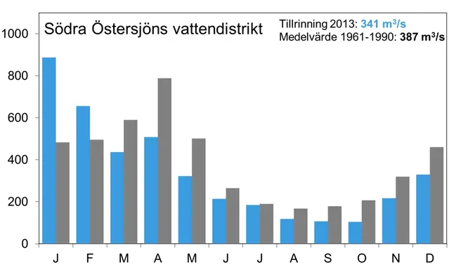 För södra Sverige var vår och höst under 2013 nederbördsfattiga och avrinningen var liten. Det speglas i att tillrinningen för Västerhavet och Södra Östersjön var under medelvärdena för månaderna från mars och till slutet av året.