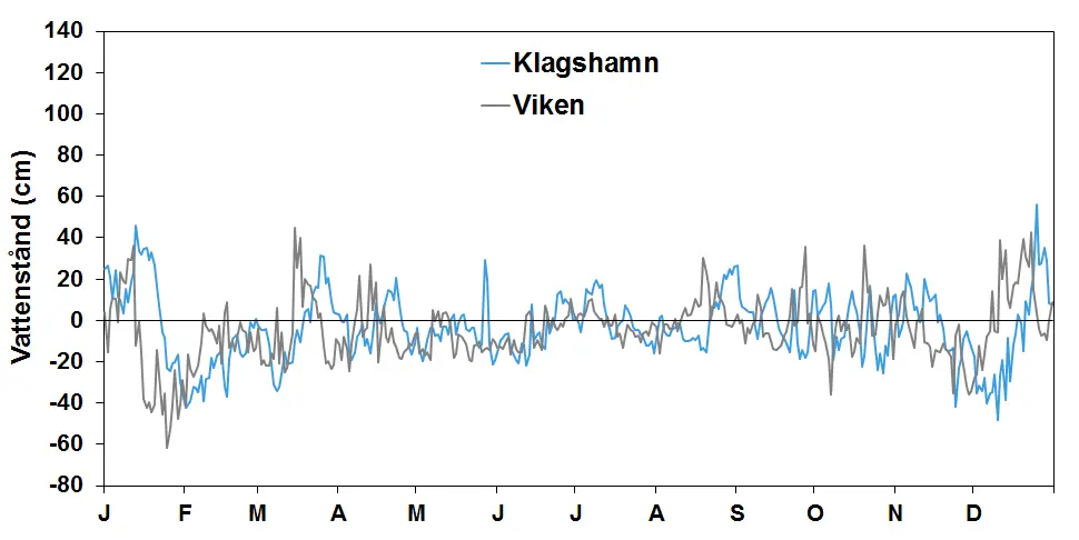 Förstora bildenHavsvattenståndet i Viken och Klagshamn (dygnsmedelvärden). För Öresund beskrivs vattenståndet (cm) i dess norra del av Viken och i dess södra del av Klagshamn. I diagrammet kan man se tillfällen då nivån i Viken är högre än i Klagshamn, dvs då det förekommer inflöde av saltvatten.