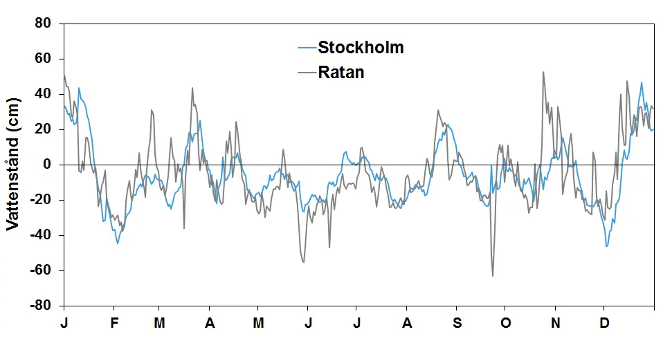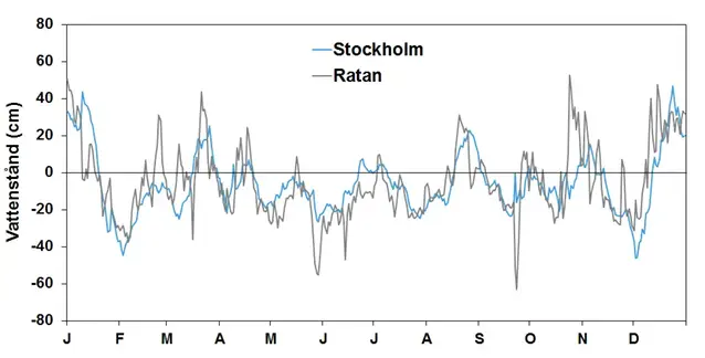 Förstora bildenStationerna Ratan och Stockholm (dygnsmedelvärden) representerar här vattenståndet (cm) i Östersjön.
