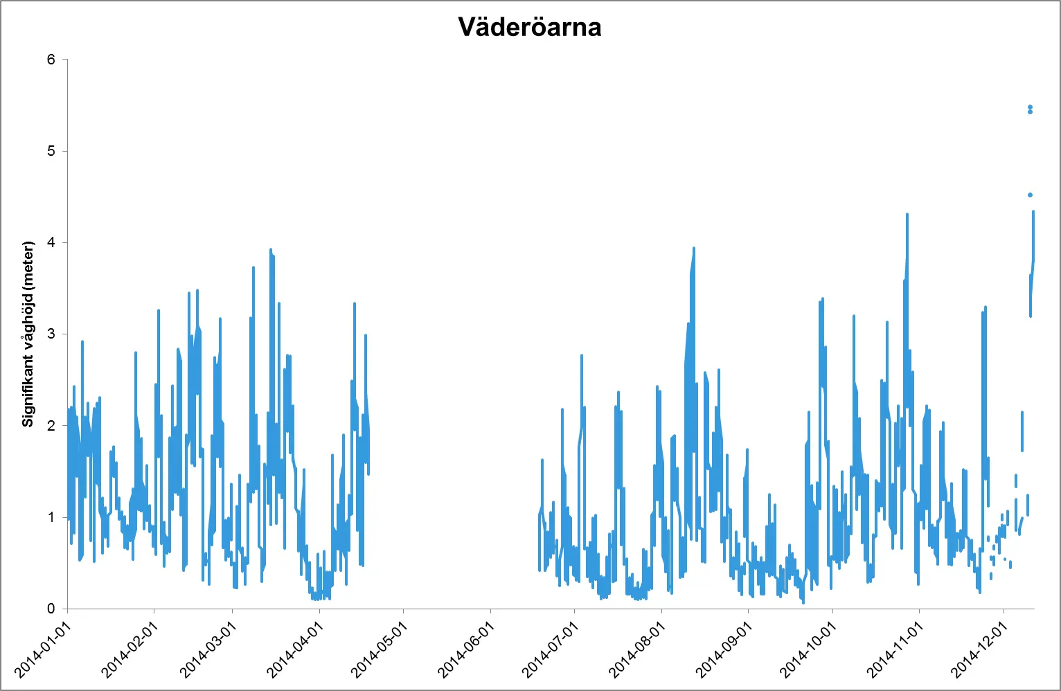 Förstora bildenDen signifikanta våghöjden uppmätt av bojen vid Väderöarna 2014. Mätningarna var inte igång under april-juni.