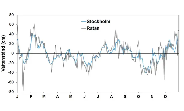 Stationerna Ratan och Stockholm (dygnsmedelvärden) representerar här vattenståndet (cm) i Östersjön.