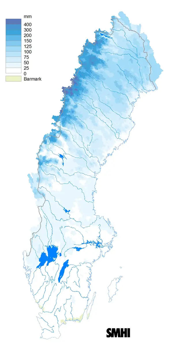 I Norrbotten och nordvästra Svealand fylldes snötäcket på under vintern. I april var snöns vatteninnehåll normalt eller över normalt i stora delar av övre Norrland. Snön smälte snabbt i början av maj vilket ledde till höga flöden i vattendragen i nordöstra Norrland, både i mindre vattendrag och i Kalixälven och Torneälven. Flödena klingade av i takt med att snötäcket försvann. I början av juni fanns det snö endast på högfjället.