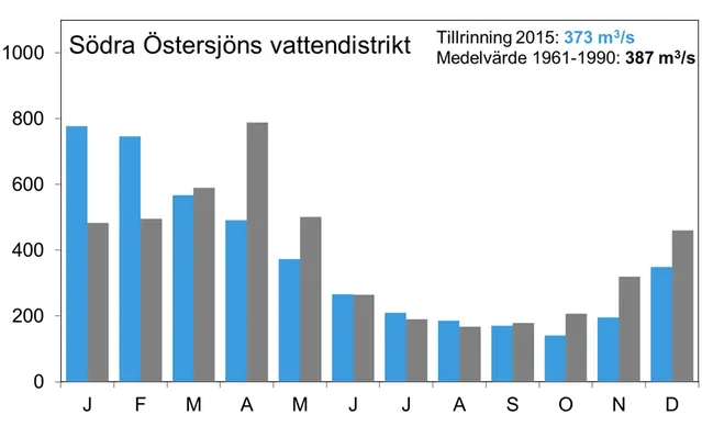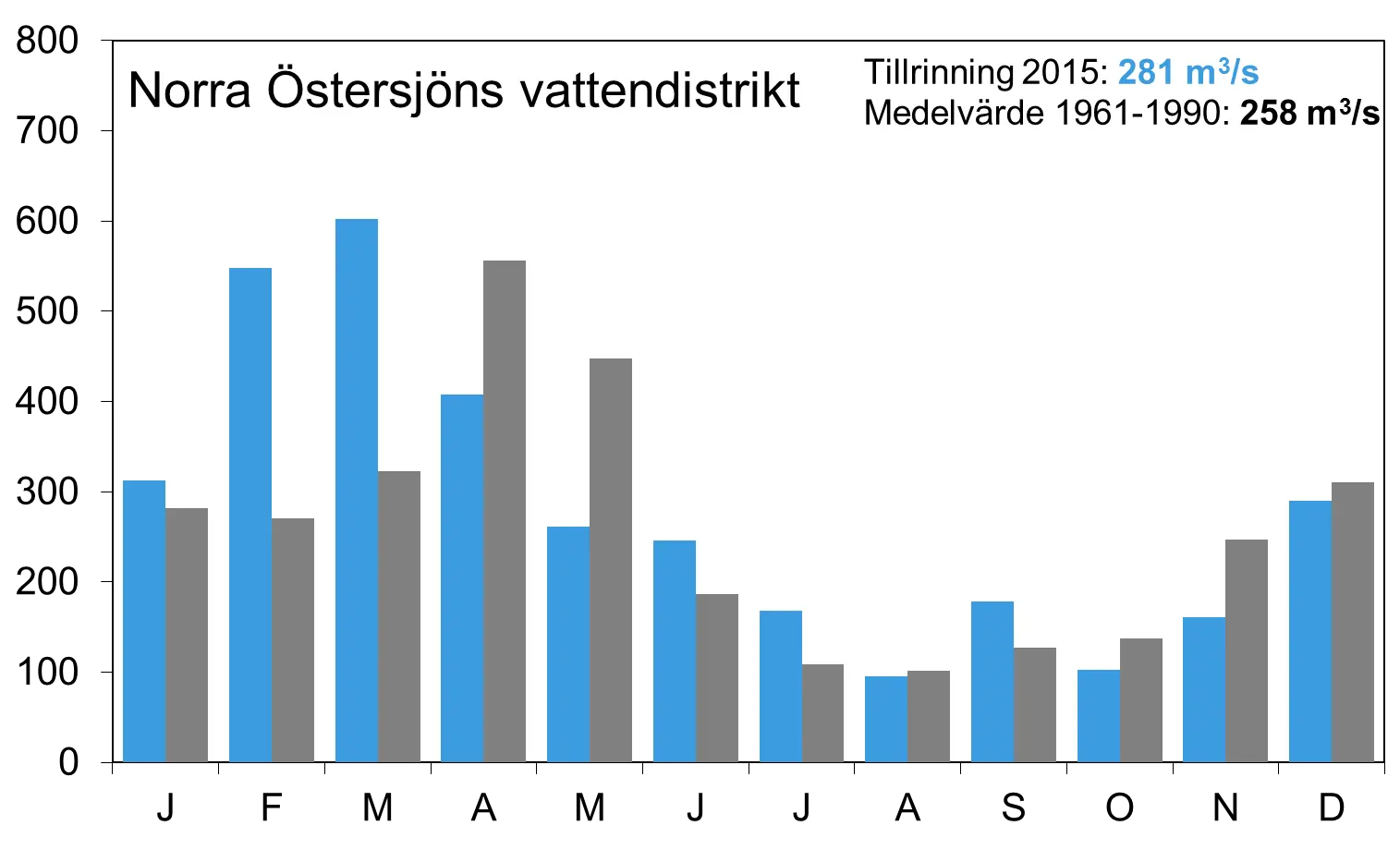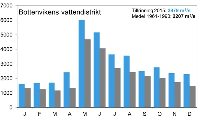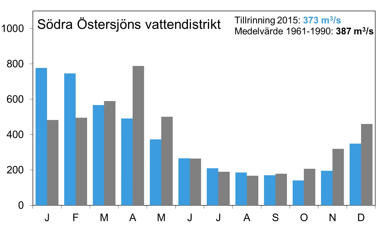 Den blå stapeln i graferna nedan visar tillrinningen 2015, den grå visar medelvärdet för normalperioden 1961-1990.