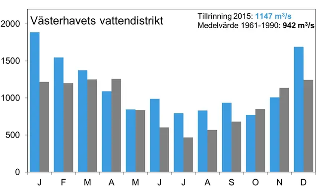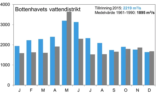 Den totala tillrinningen till haven 2015 var ca 7000 m3/s vilket är 23% över medelvärdet för perioden 1961-1990. Det är en spegling av att året var nederbördsrikt i större delen av landet.
