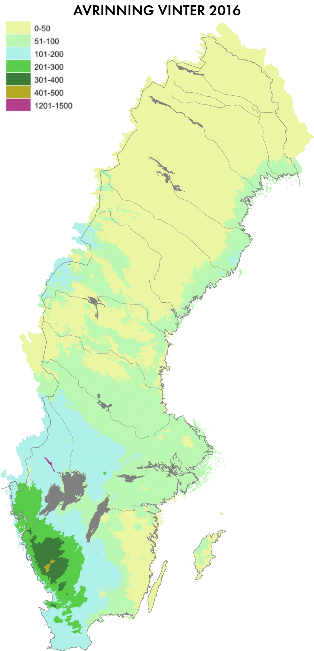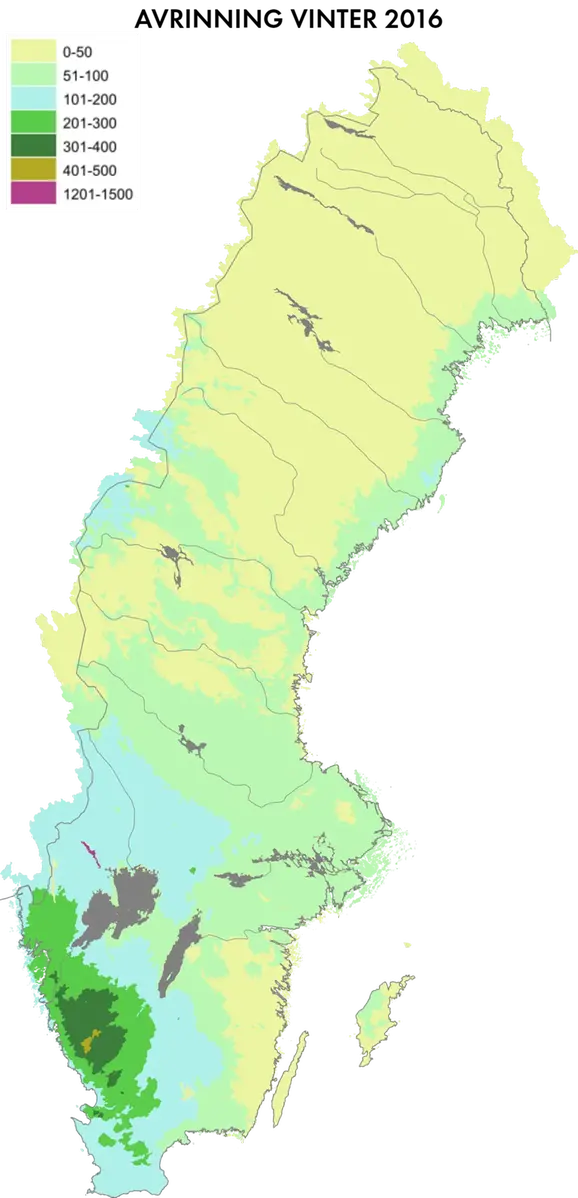 I delar av västra Götaland samt nordöstra Norrland blev det en nederbördsrik vinter. Avrinningen var därför högre än normalt i västra Götaland. Längs Östersjökusten var det däremot en torr eller mycket torr vinter med på sina håll strax under halva normalnederbörden. Avrinningen var därmed lägre än den normala i sydöstra Sverige.
