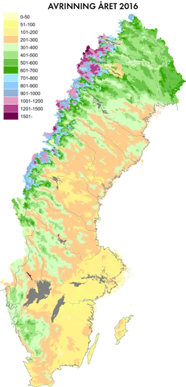 Det samlade vattenflödet från ett område i naturen kallas avrinning. Den specifika avrinningen, dvs. avrinningen per ytenhet, är ett mått på vattentillgången i området, och uttrycks ofta i mm. Avrinningskartor ger en generell överblick av vattentillgången under det gångna året respektive per säsong. Säsongerna indelas enligt: vinter (december, januari, februari), vår (mars, april, maj), sommar (juni, juli augusti) och höst (september, oktober, november).