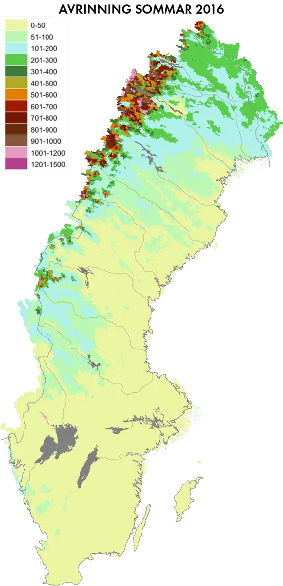 I Götaland, Svealand och södra Norrland var avrinningen låg under sommaren. Speciellt i östra Götaland var avrinningen mycket lägre än normalt. I nordöstra Norrland kom det mycket nederbörd under sommaren och där var avrinningen högre än normalt.