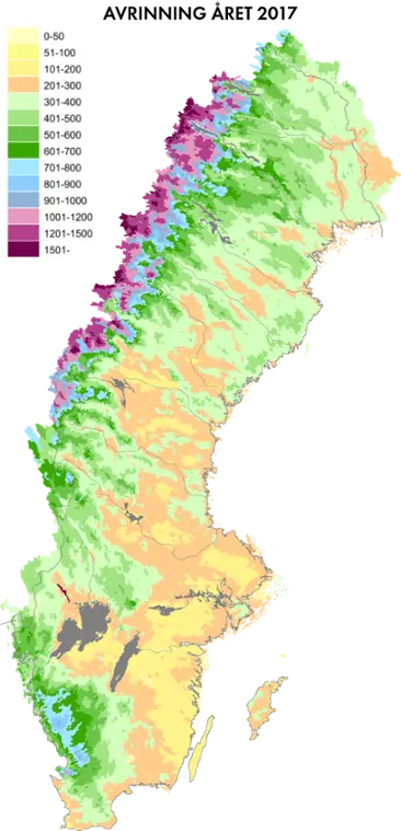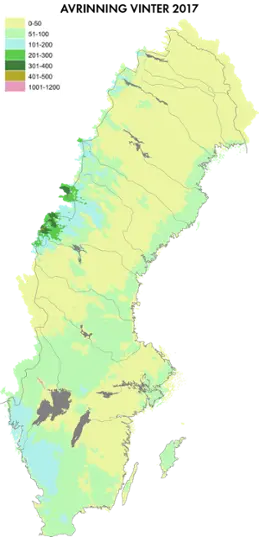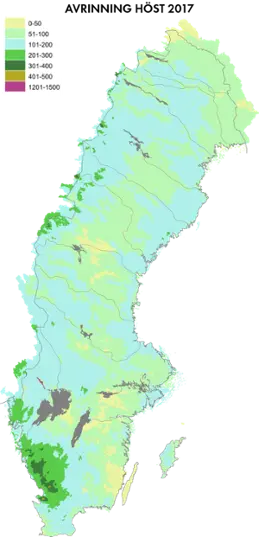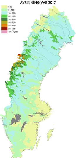 Det samlade vattenflödet från ett område i naturen kallas avrinning. Den specifika avrinningen, dvs. avrinningen per ytenhet, är ett mått på vattentillgången i området, och uttrycks ofta i mm. Avrinningskartor ger en generell överblick av vattentillgången under det gångna året respektive per säsong. Säsongerna indelas enligt: vinter (december, januari, februari), vår (mars, april, maj), sommar (juni, juli, augusti) och höst (september, oktober, november).