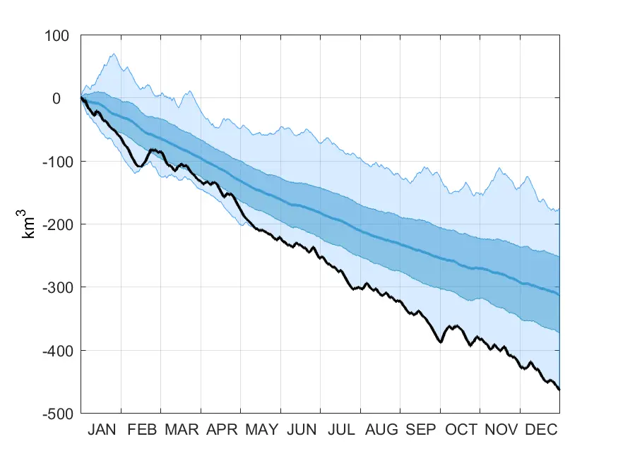 Förstora bildenFigur 1. Ackumulerat inflöde i km³ genom Öresund 2017 (svart) jämfört med 1977-2016 (blått). Medelvärdena för perioden visas som en linje och de färgade områdena anger standardavvikelsen och maximum och minimumvärden.