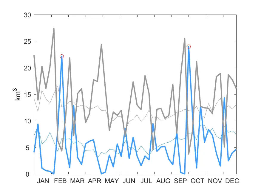 Under hela året var det endast ett par tillfällen med inflöden större än 15 km³. Vi ser de två största inflödena under året som toppar på drygt 20 km3 i den tunna blå linjen i mitten på februari och början på oktober i figur 2, markerat med röda cirklar. Under våren och sommaren skedde endast mindre inflöden, vilket är normalt för årstiden. Eftersom figuren visar ackumulerat inflöde per kalendervecka fångas inte alltid en hel inflödesperiod in vid beräkningen och korta men kraftiga inflöden syns därför inte alltid i en sådan figur.