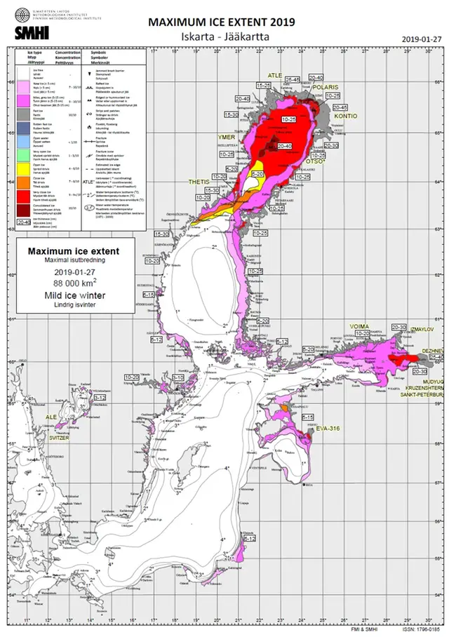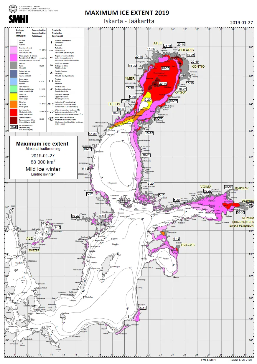 Maximal isutbredning inträffade den 27 januari med cirka 88 000 km2, vilket får betraktas som en lindrig isvinter.