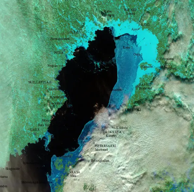 Förstora bildenOptisk satellitbild över Bottenviken 26 februari 2019, där isen visas med blå färg.