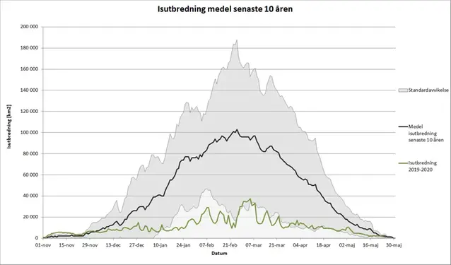 Ett medel av isutbredningen de senaste 10 åren (svart linje) med en standardavvikelse (grå yta), årets rekordlåga utbredning markerad med grön linje.