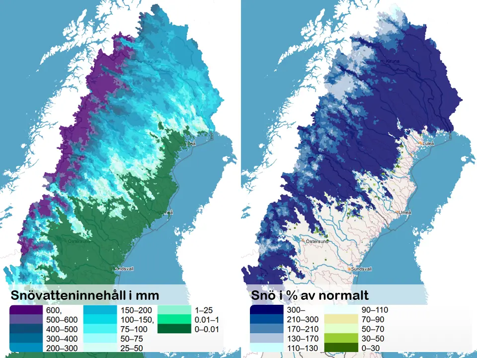 Förstora bildenTill vänster snöns vatteninnehåll i mm 2020-05-20. Till höger snöns vatteninnehåll 2020-05-20 i procent av normalt för denna tid på säsongen.