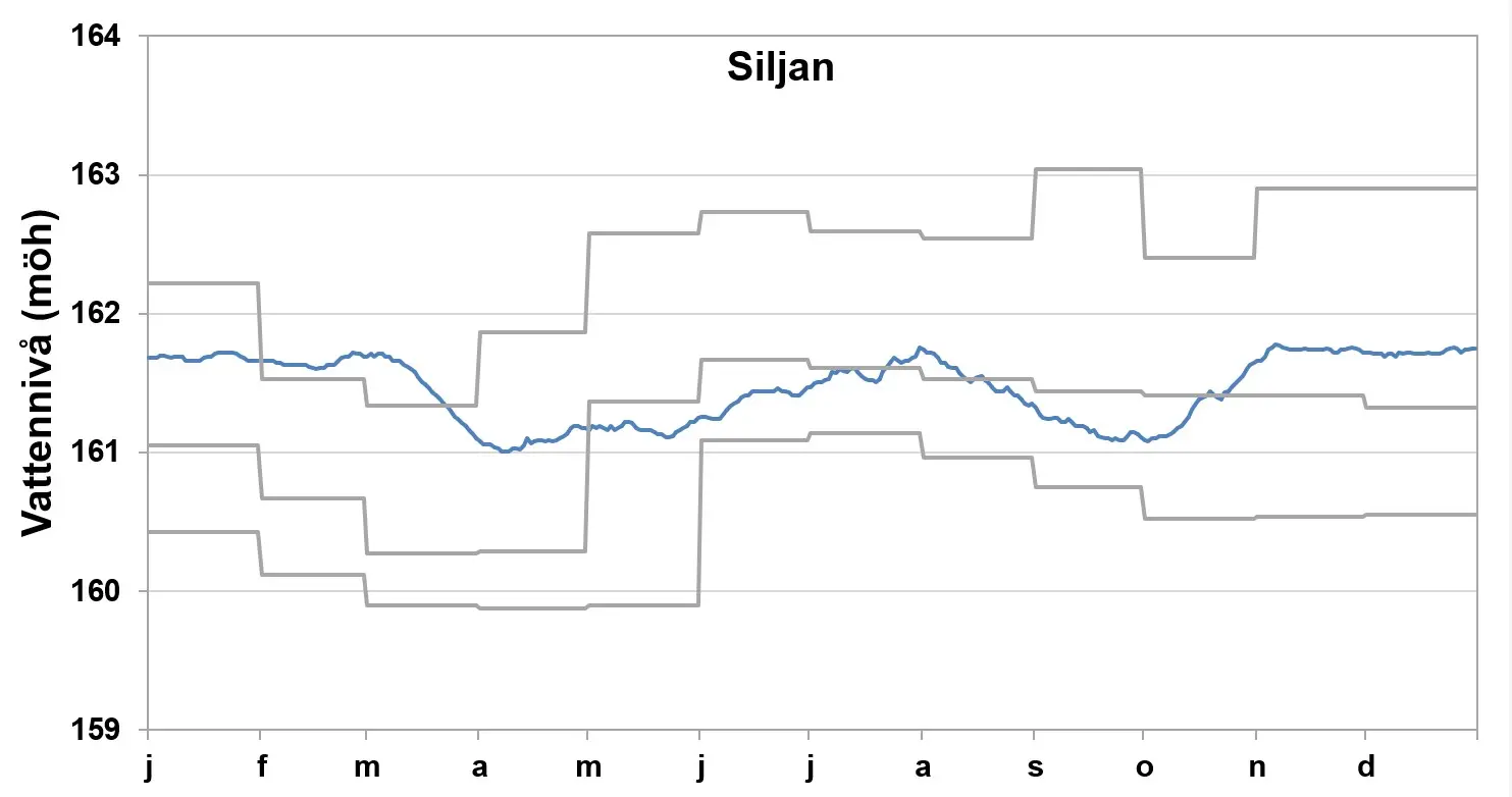 Förstora bildenDen blå linjen visar vattenståndet i Siljan 2020. De grå linjerna representerar de högsta och lägsta uppmätta månadsvärdena samt månadsmedelvärden för perioden 1964-2019. Alla nivåer anges i meter över havet i höjdsystemet RH00. Data har samlats in av Vattenregleringsföretagen i Östersund.