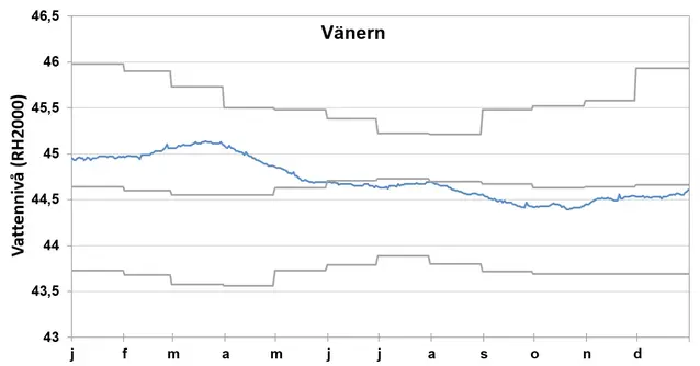 I slutet av maj hade vattenståndet sjunkit till normala nivåer för årstiden. I augusti fortsatte vattenståndet att sjunka till nivåer strax under de normala. Den blöta och milda hösten gjorde att vattenståndet sakta började stiga i oktober och nådde normala nivåer i slutet av december.