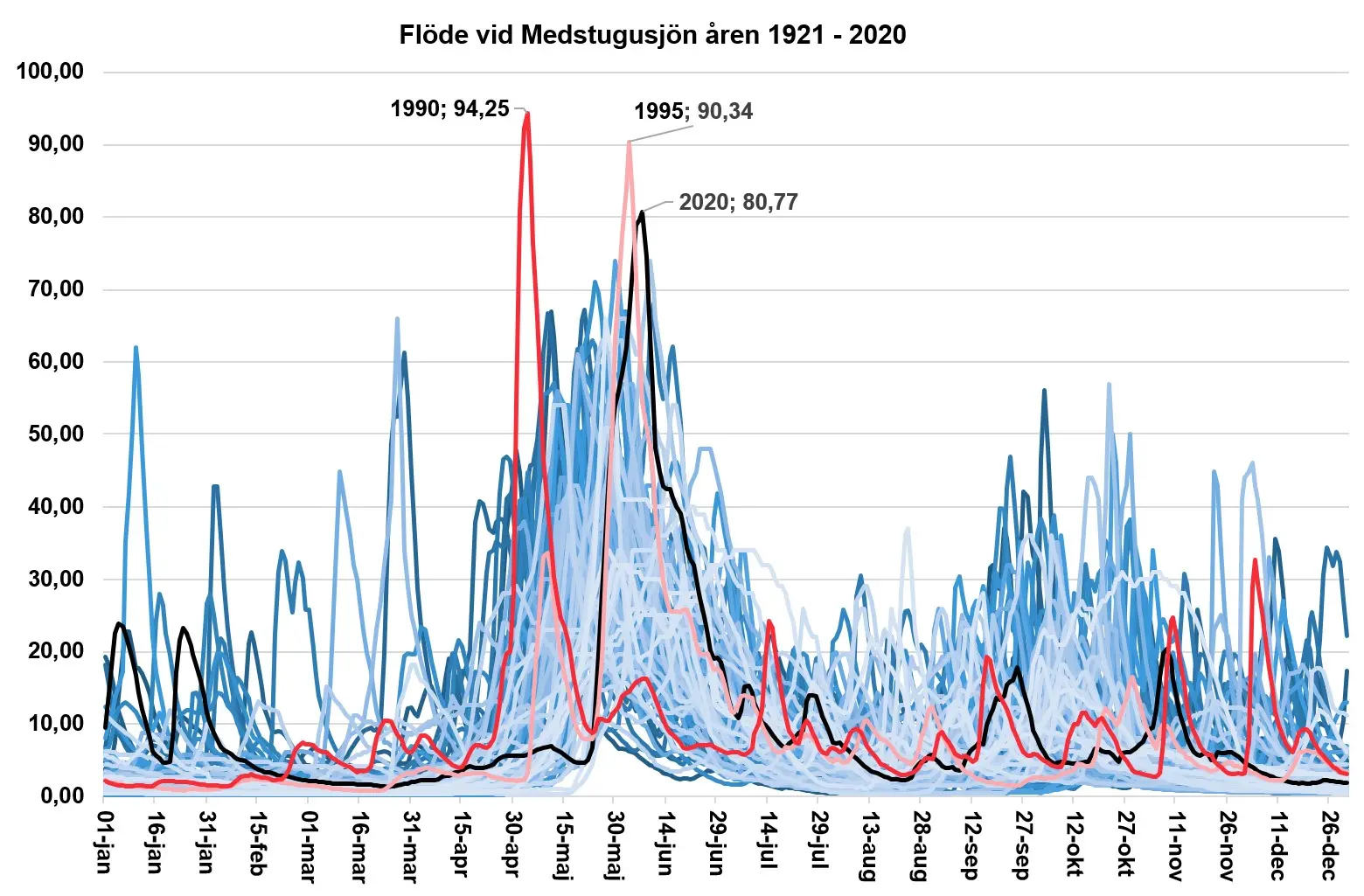 Förstora bildenVattenföringsgraf vid station Medstugan, Indalsälven där mätningarna startade 1921. Den svarta linjen representerar 2020. Den röda år 1990 med det högst uppmätta flödet och den rosa är år 1995 med en lika sen vårflod som 2020.