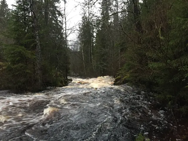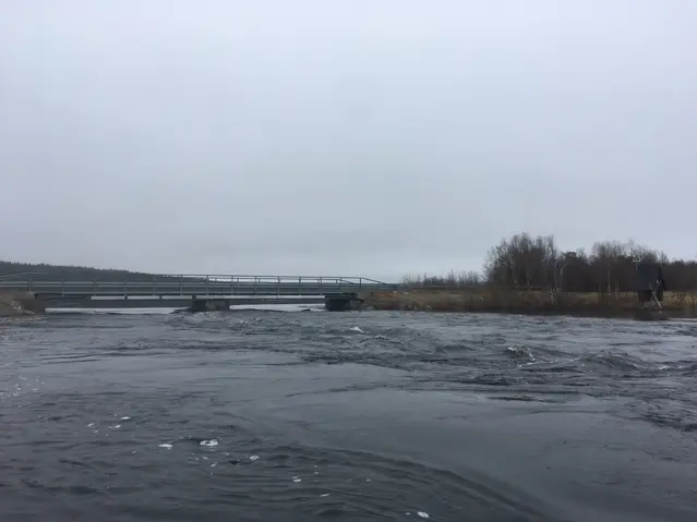 Idijoki vid SMHIs mätstation Mertajärvi den 4 juni 2020. Vattenflödet är ungefär 54 m3/s, vilket är det högsta flödet sedan 1984.