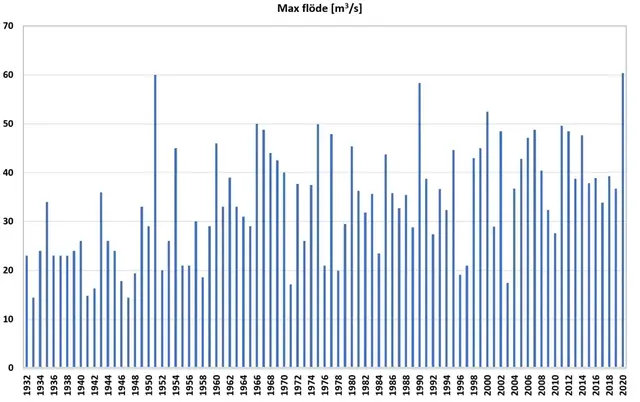 Förstora bildenVarje års högsta flöde vid stationen Hillared i Ätran. Stationen startade 1931, flödet i februari 2020 var 60 kubikmeter per sekund vilket är det hittills högsta uppmätta. 1951 var det nästa lika högt flöde. Statistiskt är det ett flöde som återkommer var 50 år.