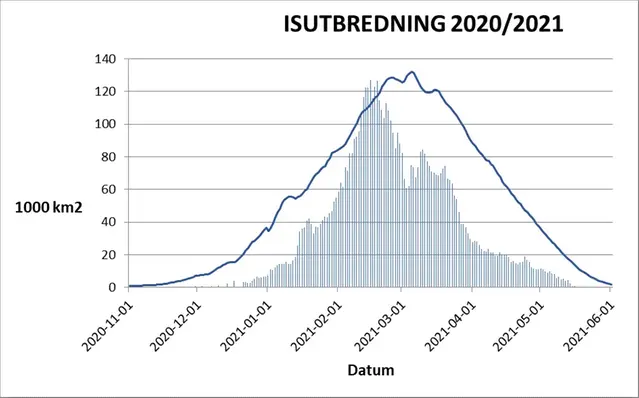 Isvintern 2020-2021 är att beteckna som normal med en maximal isutbredning den 15 februari på 127 000 km2. Summerat över hela issäsongen, låg dock isutbredningen oftast under den normala, förutom en topp i februari. Varaktigheten blev också nära den normala, men med en mycket blygsam isutbredning i början av säsongen fram till januari.