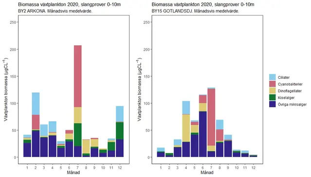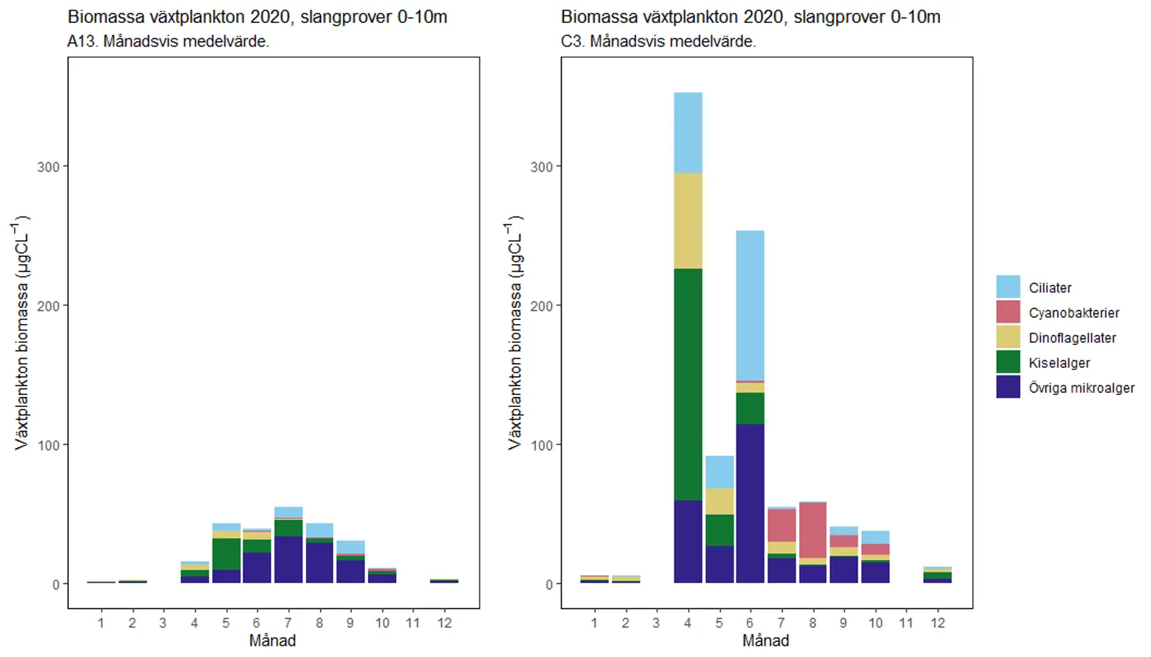 Förstora bildenDiagrammen visar totala biomassan i kol (µg/l) av olika grupper av växtplankton över året. De flesta ciliater är mikrozooplankton. De som inkluderats i diagrammen utför fotosyntes och fungerar som växtplankton.
