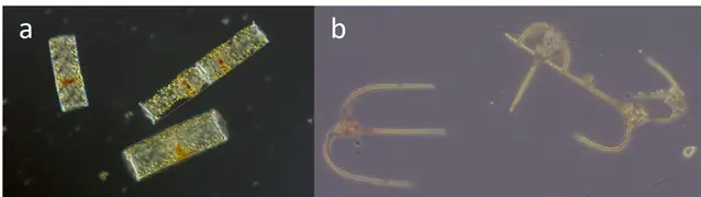 Flera fluorescenstoppar återfanns både i juni och juli utefter västkusten. Kiselalgen Guinardia flaccida (a) dominerade i juni och dinoflagellatsläktet Tripos (b) dominerade i juli.