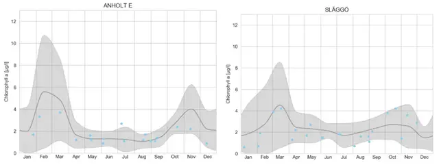 Förstora bildenDiagrammen visar mängden klorofyll a (µg/l) som integrerade värden från 0–20 meter vid stationerna Anholt E i Kattegatt och Släggö i Skagerrak. Punkterna visar 2020 års värden, linjerna visar 15 års månadsmedel (2001–2015), och de gråmarkerade områdena visar +/- en standardavvikelse.