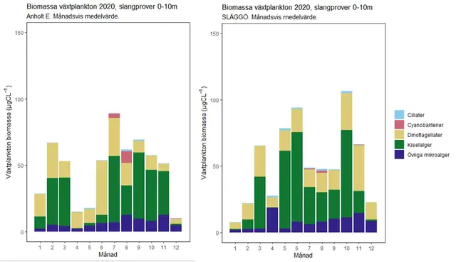 Förstora bildenDiagrammen visar totala biomassan i kol (µg/l) av olika grupper av växtplankton över året. De flesta ciliater är mikrozooplankton. De som visas i diagrammen utför fotosyntes och fungerar som växtplankton.