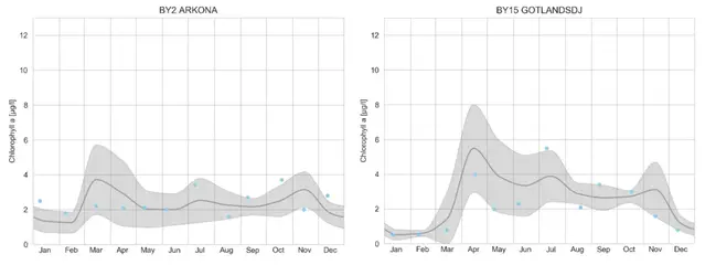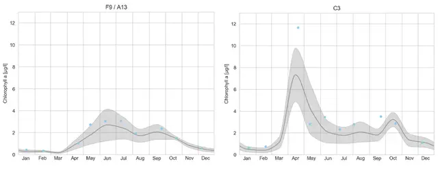 Förstora bildenDiagrammen visar mängden klorofyll a (µg/l) som integrerade värden från 0–10 meter. Till vänster representeras Bottenviken (F9/A13) och till höger Bottenhavet (C3). Punkterna visar 2020 års värden, linjerna visar tio års månadsmedel (2001–2015), och de gråmarkerade områdena visar +/- en standardavvikelse. Klorofyllmätningarna i Bottenhavet och Bottenviken är utförda av Umeå Marina Forskningscentrum.