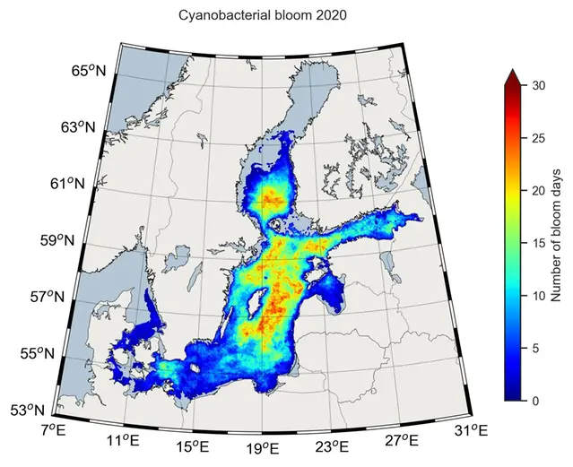 Förstora bildenAntal dagar med ytansamlingar av cyanobakterieblomning sommaren 2020. Kartan baseras på data från satelliterna Aqua, med sensorn MODIS, och Sentinel 3A och 3B, med sensorn OLCI.