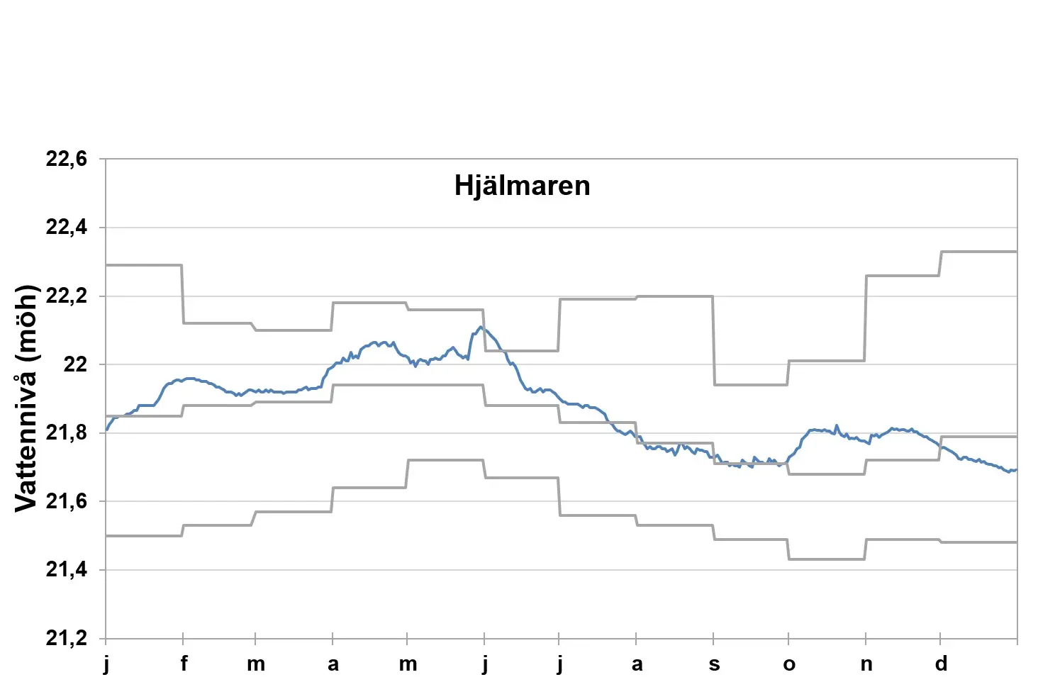 Förstora bildenDen blå linjen visar vattenståndet i Hjälmaren 2021. De grå linjerna representerar de högsta och lägsta uppmätta månadsvärdena samt månadsmedelvärden för perioden 1988-2020. Alla nivåer anges i meter över havet i höjdsystemet RH00. Data har samlats in av Hjälmarens Vattenförbund.