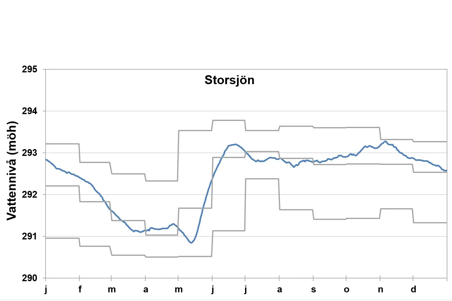 Förstora bildenDen blå linjen visar vattenståndet i Storsjön 2021. De grå linjerna representerar de högsta och lägsta uppmätta månadsvärdena samt månadsmedelvärden för perioden 1940-2020. Alla nivåer anges i meter över havet i höjdsystemet RH00. Data har samlats in av Vattenregleringsföretagen i Östersund.