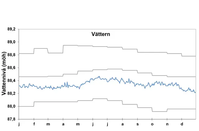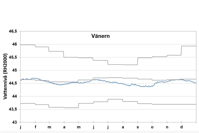 Vänerns vattennivå har följt månadsmedel över stora delar av året, endast under sommarmånaderna och början på hösten var nivåerna något under det normala. Årets högsta vattennivå inträffade i slutet på januari och det lägsta i september.