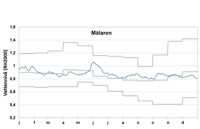 I Mälaren har vattennivån varierat runt medelvärdet under året. 2020 avslutades med stigande vattennivå och 2021 inleddes sakta sjunkande nivåer från något över det normala i januari till strax under det normala i maj. I slutet av maj föll ett kraftigt regn över Mälardalen som medförde att vattennivåerna steg snabbt. Under juni sjönk nivåerna som sedan var runt normala eller strax över normala nivåer ända fram till november. Året avslutades med sjunkande och nivåer strax under det normala för december.