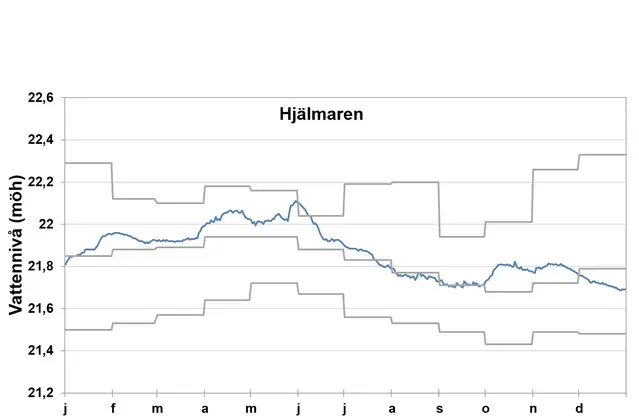 I Hjälmaren började året med ett vattennivå strax under den normala. Vattennivån steg därefter under vintern och våren och var över det normala. Regnvädret i Mälardalen i slutet av maj orsakade en snabb vattenståndsökning och vattenståndet har inte varit så högt i juni sedan den nya vattendomen infördes 1988. Utflödet vid samma tid från Hjälmaren var 101 m3/s vilket är det högsta uppmätta sedan maj 1977. Den höga tappningen ledde till sjunkande vattenstånd och mitten på juli var det på normala nivåer och var så fram till slutet av september. I oktober steg vattennivån av höstregnen och var något över det normala till december då det sjönk till strax under det normala.