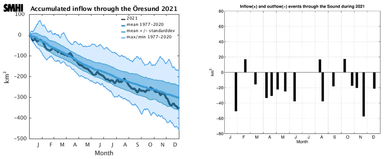 2021 års summerade in- och utflöde till Östersjön genom Öresund blev 285 km³ (in) respektive 632 km³ (ut). Medelvärden för inflöde och utflöde under perioden 1977-2020 är 319 km³ (in) respektive 623 km³ (ut). Under 2021 var alltså inflödet mindre än normalt och utflödet något högre än normalt. Det ackumulerade flödet över året (dvs. utflöde minus inflöde) är alltid ett nettoflöde ut ur Östersjön och visas som negativa siffror i figur 1.