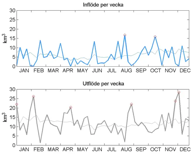 Längre perioder av in/utflöden genom Öresund kan ses i figur 1 (t.h) som staplar samt i figur 2 (den grå tjocka linjen) summerat per vecka.