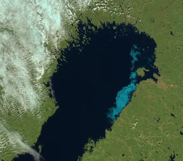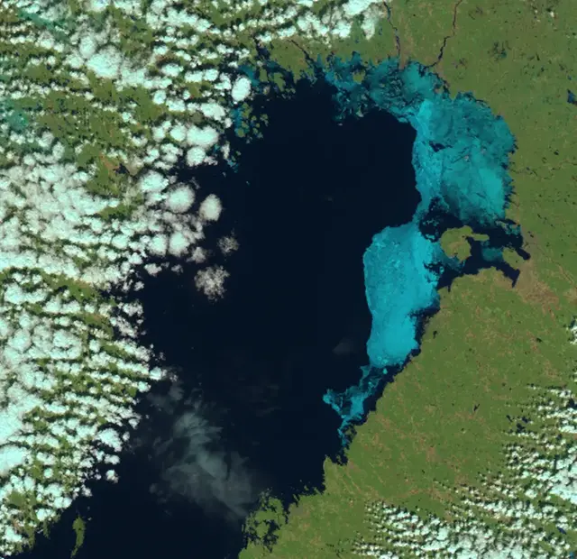 Optisk bild (NOAA) från 12 april. Isen i Bottenviken driver söderut och når Holmöarna. En råk med öppet vatten finns utmed den finska sidan från Norra Kvarken och norrut.