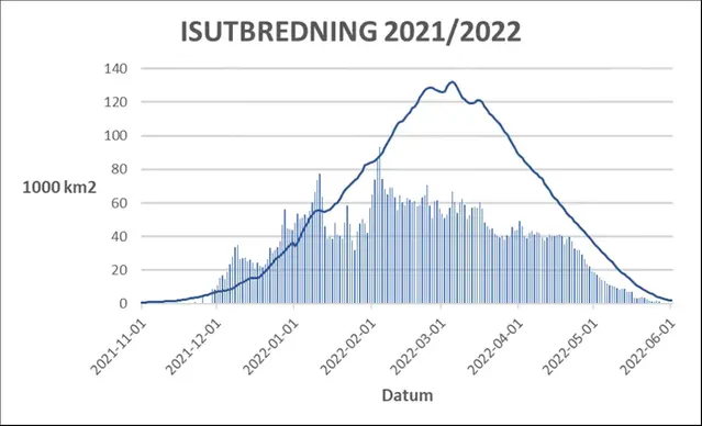 Isvintern 2021-2022 är att beteckna som lindrig med en maximal isutbredning den 4 februari på 93 000 km2. Summerat över hela issäsongen, låg isutbredningen oftast under den normala, men vid tiden för maximal isutbredning var den kortvarigt över medelisutbredningen för detta datum. Varaktigheten blev längre än den normala, med den första isen noterad redan kring den 25 oktober och den sista isen den 2 juni.