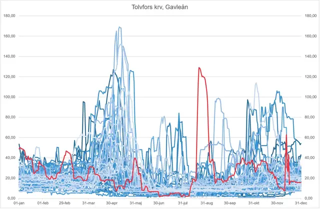 Förstora bildenFlödet vid Tolvfors kraftverk i Gavleån. Flödet i vattendraget ökar efter de stora regnmängderna i slutet av juli. Flödet 2021 presenteras med en röd linje och jämförs med åren 1967-2020.