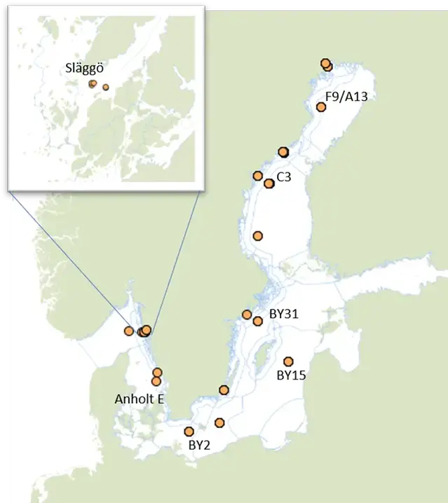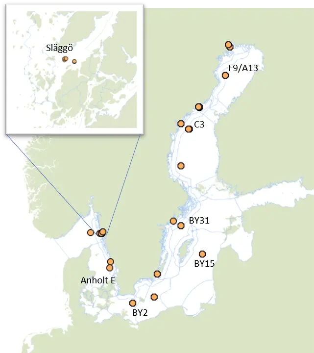Förstora bildenKarta över provtagningsstationer från det nationella utsjöprogrammet.