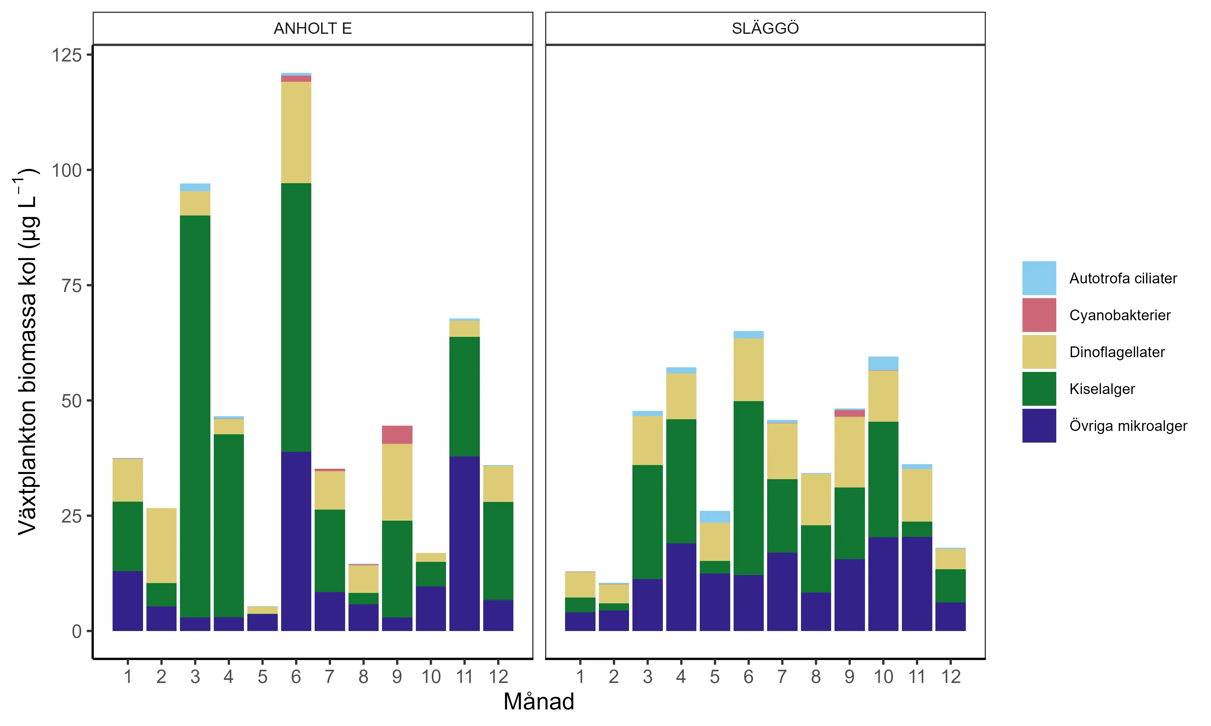 Förstora bildenDiagrammen visar totala biomassan i kol (µg/l) av olika grupper av växtplankton över året för djupet 0–10 m. Den vänstra stationen är intensivstation i Kattegatt och den högra intensivstation i Skagerrak. De flesta ciliater är mikrozooplankton. De som inkluderats i diagrammen utför fotosyntes och fungerar som växtplankton.