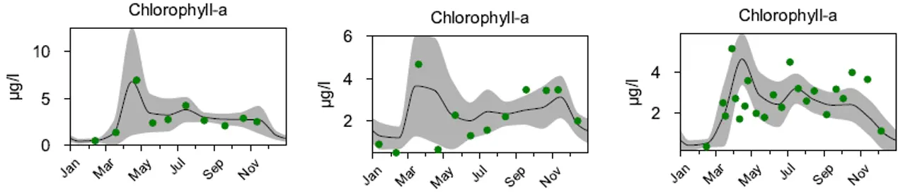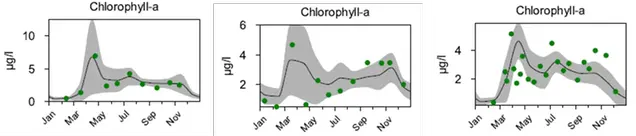 Förstora bildenDiagrammen visar mängden klorofyll a (µg/l) som integrerade värden från 0–10 meter. Bild till vänster visar BY15 i östra Egentliga Östersjön, bild i mitten visar BY2 (Södra Östersjön) bild till höger visar BY31 Norra Egentliga Östersjön. Punkterna visar 2022 års värden, linjerna visar 30 års månadsmedel (1991–2020), och de gråmarkerade områdena visar +/- en standardavvikelse.