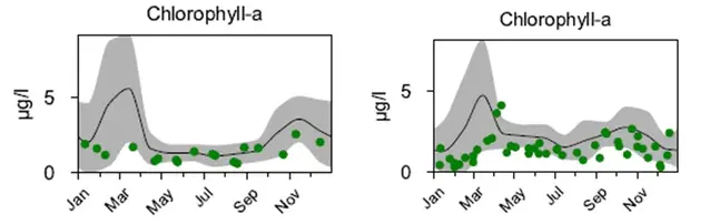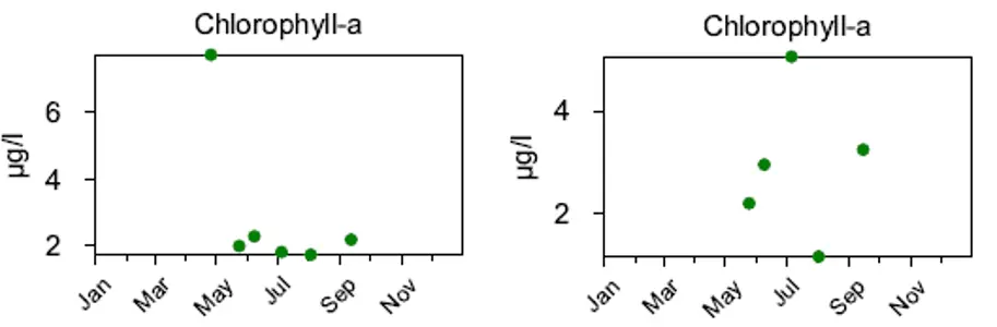 Förstora bildenDiagrammen visar mängden klorofyll a (µg/l) som integrerade värden från 0–10 meter. Till vänster representeras Bottenhavet (C3) och till höger Bottenviken (F3/A5). Punkterna visar 2022 års värden, linjerna visar tio års månadsmedel (2001–2015), och de gråmarkerade områdena visar +/- en standardavvikelse. Klorofyllmätningarna i Bottenhavet och Bottenviken är utförda av Umeå Marina Forskningscentrum.
