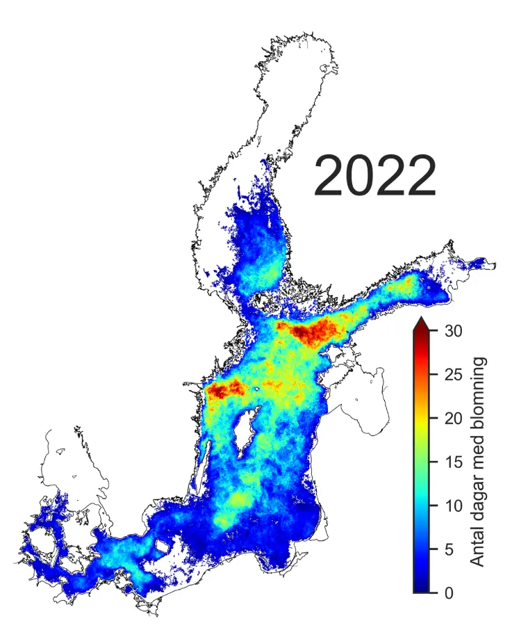 Förstora bildenAntal dagar med ytansamlingar av cyanobakterieblomning sommaren 2022. Kartan baseras på data från satelliterna Aqua, med sensorn MODIS, och Sentinel 3A och 3B, med sensorn OLCI.