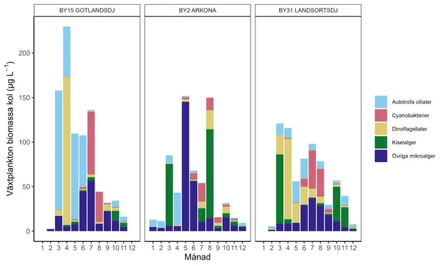 Förstora bildenDiagrammen visar totala biomassan i kol (µg/l) av olika grupper av växtplankton över året. Bild till vänster visar BY15 i östra Egentliga Östersjön, mitten visar BY2 (södra Östersjön) samt bild till höger visar BY31 norra Egentliga Östersjön. De flesta ciliater är mikrozooplankton. De som visas i diagrammen utför fotosyntes och fungerar som växtplankton.