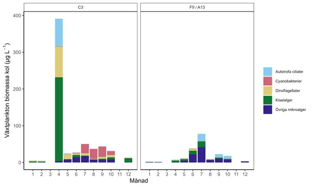 Förstora bildenDiagrammet visar totala biomassan i kol (µg/l) av olika grupper av växtplankton över året. De flesta ciliater är mikrozooplankton. De som visas i diagrammen utför fotosyntes och fungerar som växtplankton.